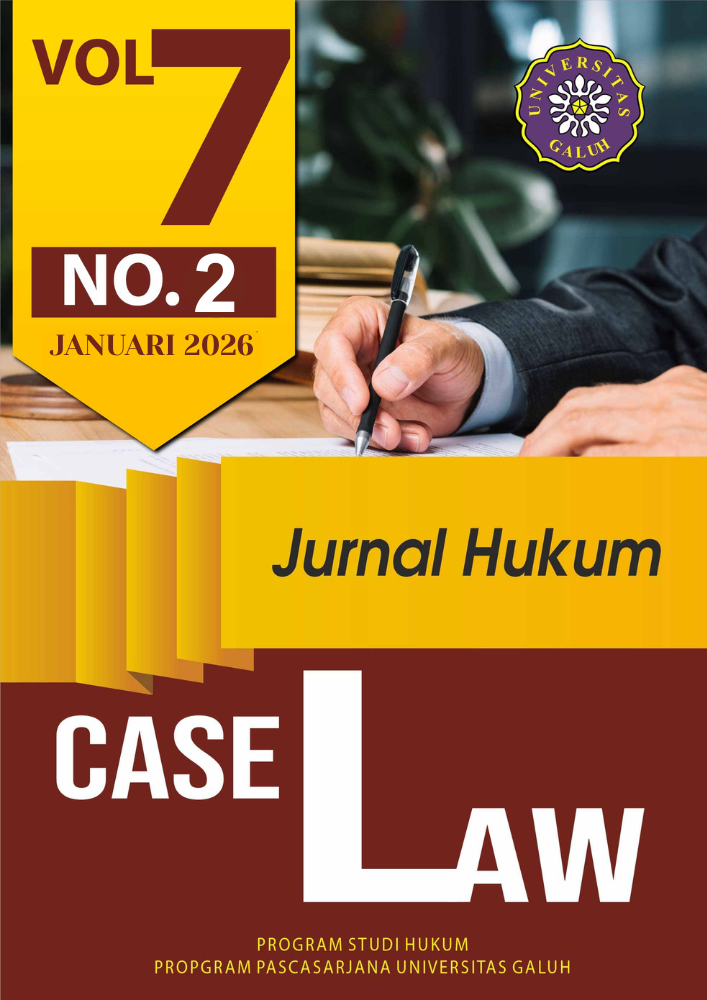 Vol. 6 No. 2 (2025)Case Law : Journal of Law adalah jurnal ilmiah untuk bidang penelitian hukum yang diterbitkan oleh Program Studi Hukum Program Pascasarjana Universitas Galuh. Jurnal hukum Case Law ini mencakup hasil-hasil penelitian, mahasiswa, dosen, praktisi dan peneliti lainnya di berbagai bidang ilmu hukum secara studi kasus, kajian teoritis, perbandingan hukum dan bidang kajian yang berkaitan dengan hukum dalam arti luas. Jurnal ini diterbitkan dua kali dalam setahun (Juli dan Januari). Jurnal ini diharapkan menjadi sarana untuk pengembangan intelektual akademisi dan praktisi serta mampu mengedukasi masyarakat dengan meningkatkan budaya penelitian hukum.