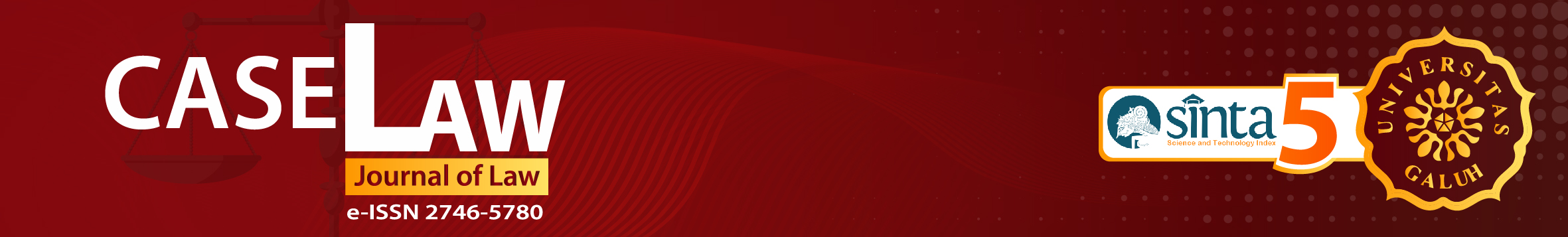 Case Law : Journal of Law adalah jurnal ilmiah untuk bidang penelitian hukum yang diterbitkan oleh Program Studi Hukum Program Pascasarjana Universitas Galuh. Jurnal hukum Case Law ini mencakup hasil-hasil penelitian, mahasiswa, dosen, praktisi dan peneliti lainnya di berbagai bidang ilmu hukum secara studi kasus, kajian teoritis, perbandingan hukum dan bidang kajian yang berkaitan dengan hukum dalam arti luas. Jurnal ini diterbitkan dua kali dalam setahun (Juli dan Januari). Jurnal ini diharapkan menjadi sarana untuk pengembangan intelektual akademisi dan praktisi serta mampu mengedukasi masyarakat dengan meningkatkan budaya penelitian hukum.